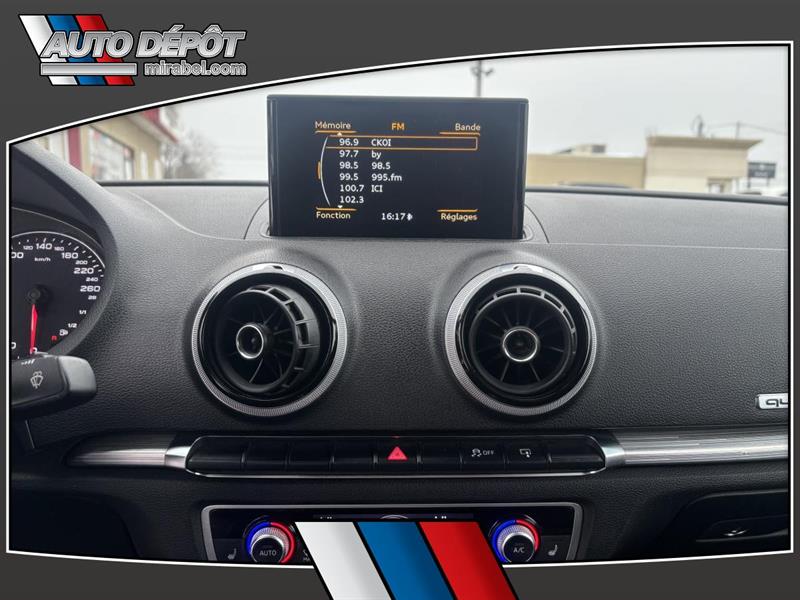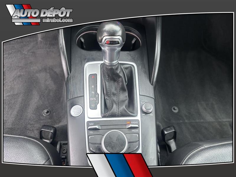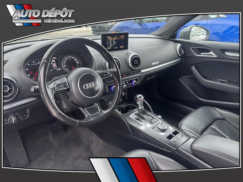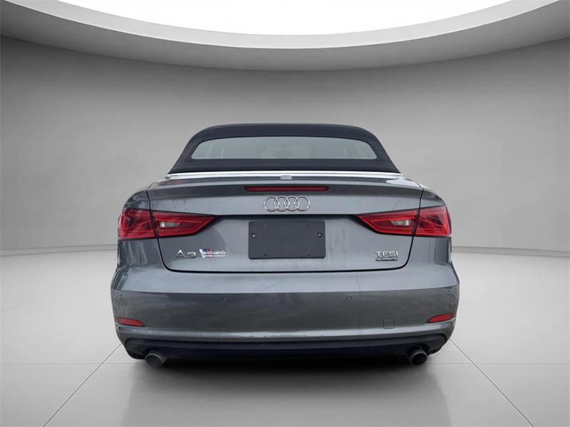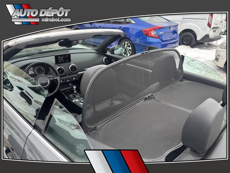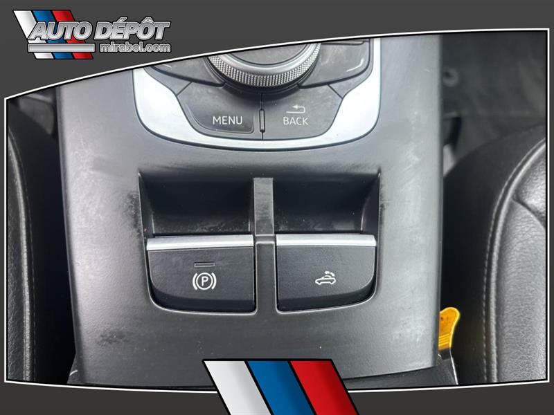 LAudi A3 2015 Cabriolet 2 portes 2.0T quattro Progressiv combine le plaisir dune décapotable et lassurance dune traction intégrale. Cet exemplaire usagé gris avec intérieur noir affiche 116 615 km une transmission automatique et un moteur 20 L sans plomb. Il est offert chez Auto Dépôt Mirabel à Mirabel. CARACTÉRISTIQUES DU A3 Cabriolet 2 portes 2.0T quattro Progressiv »» Décapotable 2 portes toit souple »» Traction intégrale quattro »» Pack éclairage ambiant inclus »» Phares HID et phares automatiques GARANTIE »» Garantie légale seulement »» Garantie dusage »» Garantie de durée raisonnable »» Garantie contre les vices cachés CARACTÉRISTIQUES DE SÉCURITÉ AVANCÉES »» Freins antiblocage (ABS) »» Contrôle de stabilité électronique »» Coussin gonflable conducteur et passager »» Coussins gonflables latéraux PERFORMANCE ET EFFICACITÉ »» Moteur 20 L sans plomb »» Transmission automatique à double embrayage »» Transmission automatique 6 vitesses »» Traction intégrale pour motricité accrue CONFORT »» Climatisation avant à deux zones »» Contrôle automatique de la température »» Sièges avant chauffants »» Support lombaire conducteur et passager TECHNOLOGIE ET CONNECTIVITÉ »» Intégration Bluetooth pour appels mains libres »» Commandes audio directement au volant »» Radio satellite »» Vitres électriques et verrouillage automatique ESPACE DE CHARGEMENT »» Accès au coffre arrière depuis lhabitacle »» Pneu de secours inclus »» Dégivreur de vitre arrière »» Coffre arrière accessible et pratique APPRÉCIÉ DES AUTRES PROPRIÉTAIRES »» Agrément de conduite avec traction intégrale »» Confort des sièges avant chauffants »» Transmission à double embrayage réactive »» Conduite à ciel ouvert toit décapotable Avec sa traction intégrale sa transmission automatique à double embrayage et ses phares HID lAudi A3 2015 Cabriolet 2 portes 2.0T quattro Progressiv vise une conduite rassurante et agréable au quotidien. Les rétroviseurs chauffants et électriques le rétroviseur intérieur électrochromatique et la climatisation à deux zones ajoutent au confort été comme hiver. Le NIV de ce Audi A3 Cabriolet 2 portes 2.0T quattro Progressiv 2015 est le WAU3FTFF6F1129XXX.